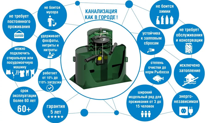 - Продолжает работать даже при сильных морозах — бактерии не боятся перепадов температур, от этого не страдает корпус или важные узлы;