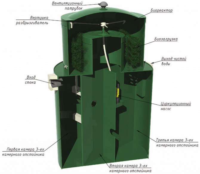 Конструкционно септик состоит из нескольких камер, с разной функциональностью. Его принцип работы очень напоминает работу других аналогичных моделей, однако есть существенные отличия:
